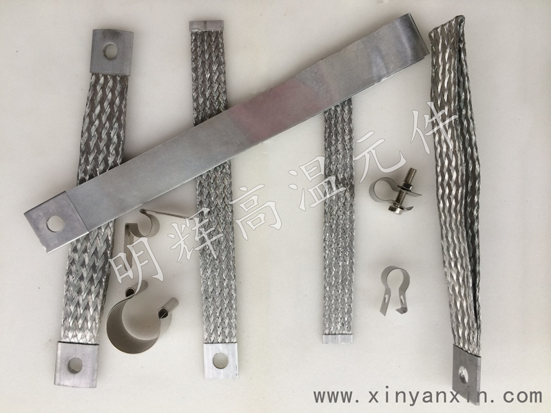 硅碳棒编织带,又称硅碳棒连接线、导电带、软连接 ,登封市明辉高温元件有限公司 订做硅碳棒铝丝编织带,直径12-45硅碳棒常用编织带大量现货,可以订做。有些需要双层或者4层叠加起来使用,孔径大小可以订做,如6.5、8.5.10.5、18等。